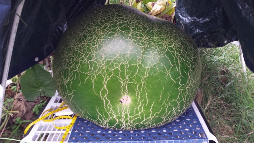 270 kent bushel gourd. Has a few growth cracks ! LOL I guess if you want pretty, pick em early. estimates a few pounds bigger then mama, but mama went heavy. lets hope it weighes well on saturday.