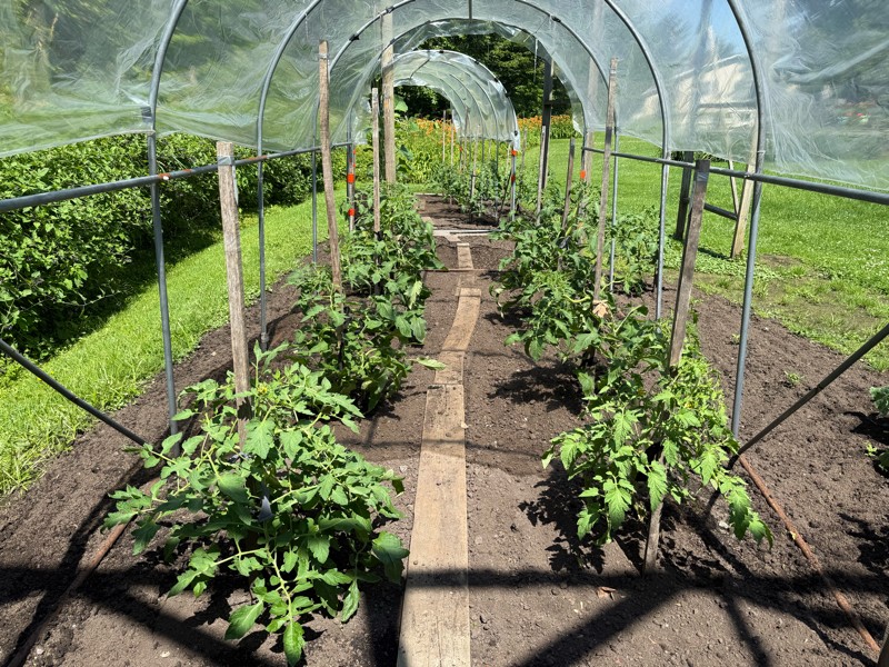 Tomato alley keeps on growing well. There have been a few first truss mega blooms but not sure if any got fully pollinated yet. Our biggest tomato was 5 foot up the plant so we still are hopeful as the season progresses.