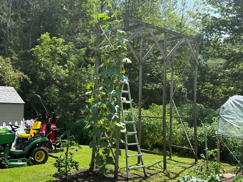 The 144 MacDonald long gourd is now on the top of the 14.5 foot trellis and females are starting to show. The pollination sweet spot is right around the 20 foot mark or further out.