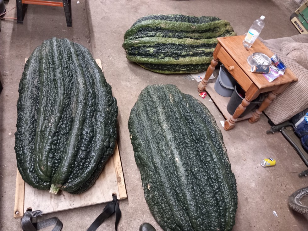 The three sound marrows are residing in the shed untill the end of the month. Although no WR this year I'm very happy with this season. I'll never know for sure as they were never weighed but I started off with 16 plants, lost one to mosaic virus early on, one was a runt at about 150 lbs and the other 14 were all in excess of 220 lbs. Next year I will have to cut down a little as I may not have so much time but the good news is my son Jack will be growing in the patches I won't be.