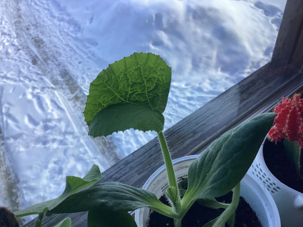 My field pumpkin's leaf is really pressing against the window.