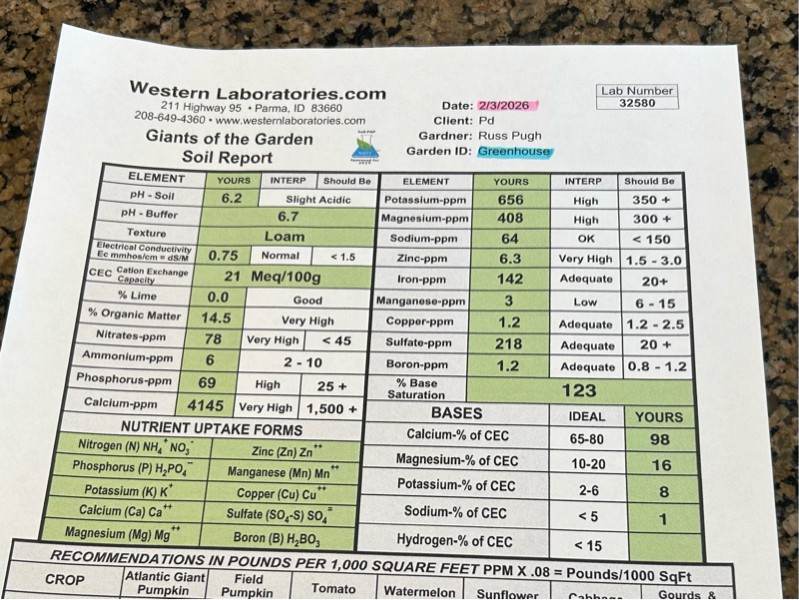This is my soil test report. Besides increasing my Manganese and Boron, all I really needed to dial in was my pH. This year I plan to re-test periodically to make sure my nutrient levels and their ratios stay good throughout the season. In-season testing will be a new thing for me this year!