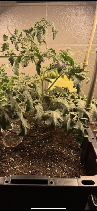 My little backup tomato for the indoor grow is starting to gain a little. I left it in good hands while I was away in SLC. I rigged up a makeshift drip system so my helper just had to fill the reservoir when the plant got droopy. I know it doesn't have enough plant, but I'll allow it.