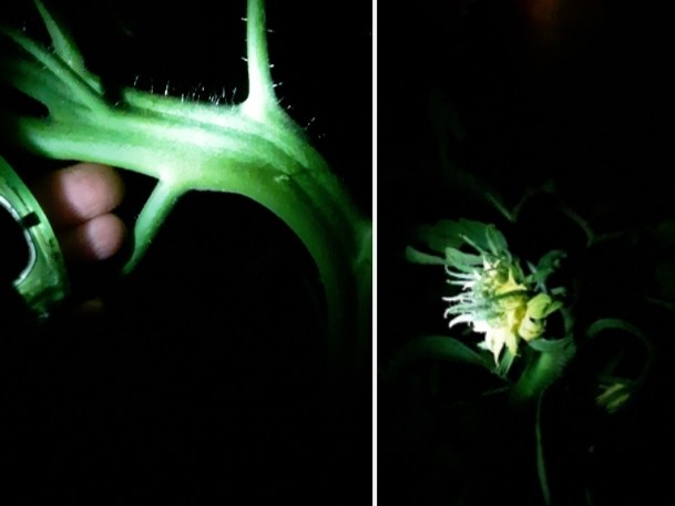 Some anomalies, perhaps worthy of note... I had a couple side shoots act like mains. I have a fat round first-truss-like mega on a side vine on the 5.16 Greene (right) but the plant is acting like it doesnt want it... and the stalk on the 3.9 Leurs looks every bit like a fat main (almost the size of two of my fingers) but again its just a side shoot. Having trouble getting anything to set, but multiple large megas on the 3.9 Leurs. Huge plant. It should easily have the energy to grow anything that gets set.