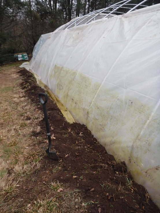 Here the tail end of the plastic is folded to fit into the trench and then the rest (majority) of the soil is placed on top. This helps to ensure it is well secured in place. Once it gets rained on the soil adds plenty of weight. The key is the self-centering of the plastic first and then securing it with this step.