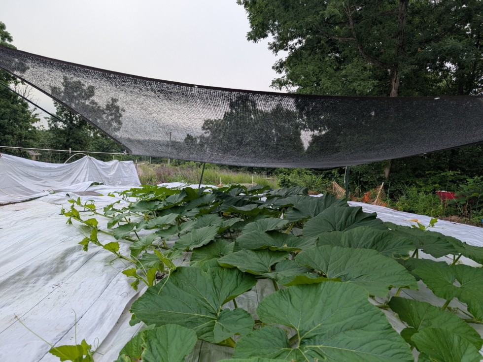 This is the 2471 just prior to pollination. This is probably the best plant I've had for this time of year. The weed fabric is a bit of a mixed bag, it's a real pain getting down and cutting holes at every node, and because it's white, it seems to let enough light in for weeds to generate under it. So I'm also cutting holes and spraying glyphosate to kill weeds. Once the vine roots down it does seem to hold the fabric close enough to keep weeds from germinating. After talking to Richard Bottorf last year, I'm not burying nodes this year, as I do think it contributed to disease pressure that rotted my vine, but I am still using clone-x on the bottom root, against the recommendation of several experienced growers. I strongly believe this increases the heat resistance of the plant, and helps pull in more nutrients and water. Timing is important, as if you apply too soon, it will stunt or terminate secondaries, but I think it's worthwhile.