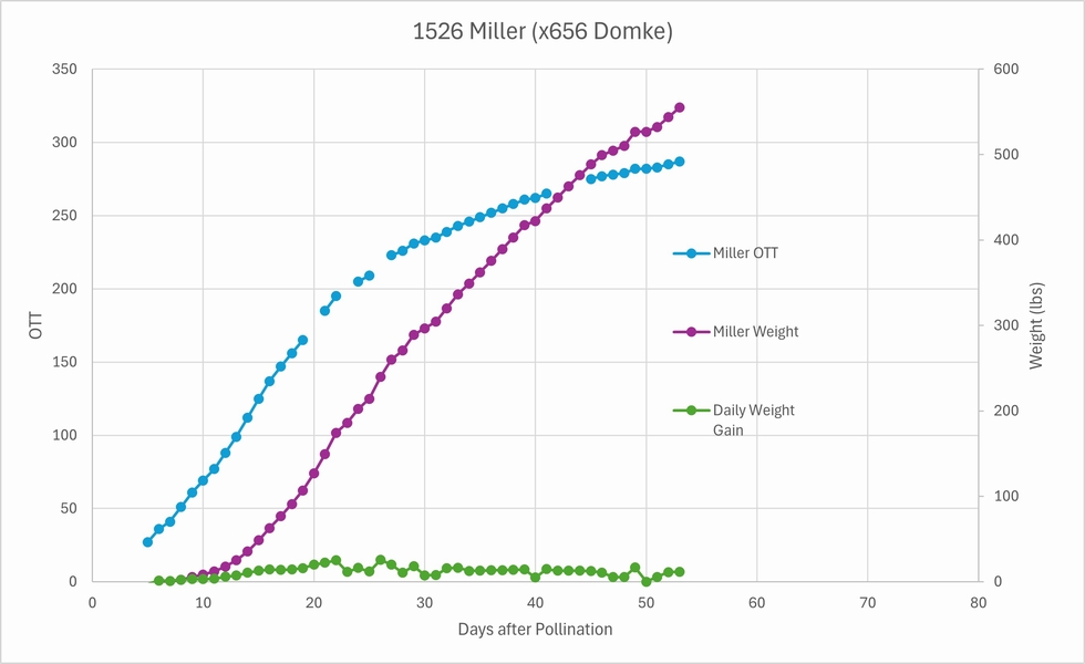 1526 Miller plant is starting to show age and wear-and-tear. Suddenly a lot of squash bugs of all ages + eggs, and scattered light powdery mildew. Trying to keep those from getting out of control with weekly Spectracide (Immunox+Permethrin). Pumpkin still looks decent and is adding 8-9 pounds a day, averaged over 5 days. Measuring most days, but daily growth is often within the +/- 0.5" measurement error that I get.