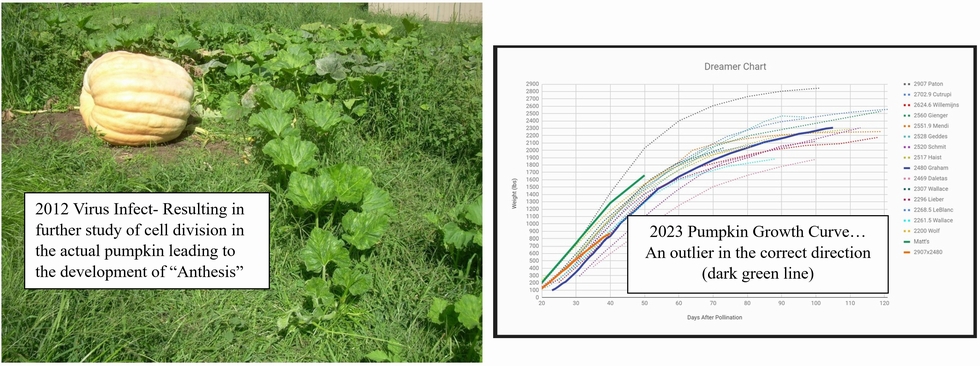 The first was back in 2012 https://www.bigpumpkins.com/Diary/DiaryViewOne.asp?eid=190092 This was a pumpkin that did not become infected with mosaic virus despite the plant becoming infects. This was also the only pumpkin that was 20+days old when the plant became infected with the virus and the pumpkin itself did not show any signs of the virus despite the plant being fully infected. This led to the idea that cell division only occurs for the first 20-days and further investigation into cellular biology. From the findings of this pumpkin the hormone spray "Anthesis" was developed after extensive research. https://www.bigpumpkins.com/Diary/DiaryViewOne.asp?eid=234656