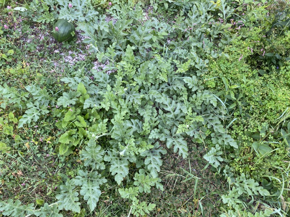 Despite the encroaching winter, this late volunteer is making a run at producing a fruit, surprisingly.... look at how healthy the leaves are on this little volunteer melon. It is determined to set seed before the winter. It just goes to show you how youth wards off disease. In a mature plant like the one shown in the previous picture, it went down completely this week.