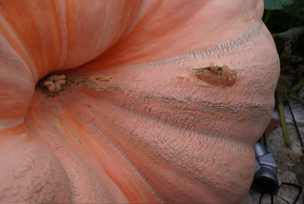 This is a prime example of "tears before breakfast" with shock as the sheet was uncovered in the morning to reveal some odd pustule growth on the pumpkin. There is also some water soaking noticed in the surrounding tissue since it seems the source for the growth is just under the surface of the pumpkin.