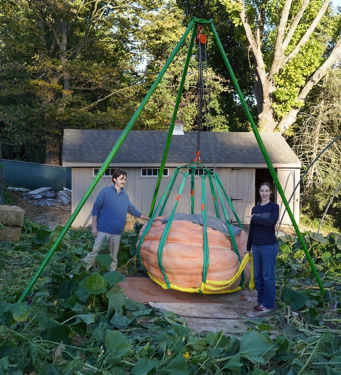 Alex N. for constructing the metal lifting ring and the metal tripod tested to an actual 4,000+lb and stress tested to provide a theoretical maximum lift capacity around 6,000+ pounds. Hard to complain about overbuilding when it comes to lifting a pumpkin you spent all year on.