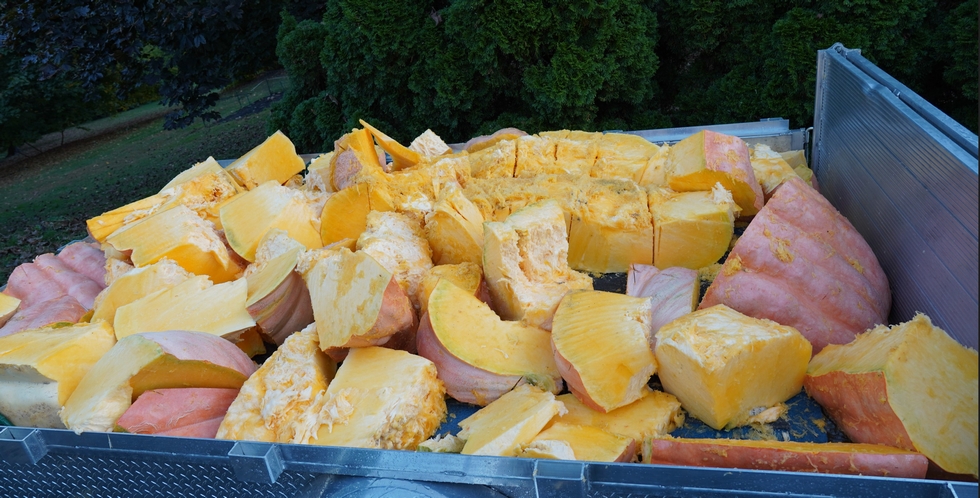 Here is the pumpkin fully chopped up and heading for the compost pile in the woods. This was an unbelievable season despite the disappointing disqualification, it is great to know what the pumpkins actually weight was on a certified weigh-off scale and witnessed by many growers.