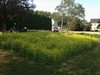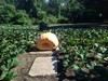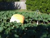 The 1998 Jutras pumpkin. Pollinated on June 23, and is thirteen feet up the main. This plant has about 900 sf of growing area. Just a few small vines left to terminate