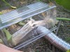 A few days ago I found this area in the main vine about 2 ' away from the pumpkin on the 823 Rahe. I had been putting fungicide on it for a little while but then the brush poked through and I found foam. So I cut a hole to let it drain. I then covered it with the hydrator drawer from my fridge. Then I put 4" flexible aluminum exhaust vent right in front of the hole.