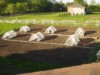 Sites were prepared by digging a pit about a foot or so deep by 30-36" in diameter, then back filling with a mixture of 10 year old sheep manure, peat moss and amended top soil and mounding up about a foot or so above grade and sloping outwards about 4ft in diameter. The mounds are covered with black plastic before erecting the hoop houses,