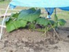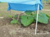 Extream heat and humidity the last two days. I removed all the black plastic last night. Soil temp last night inside the hoops is 80F. 90F outside mid day today. Pumpkins are gowing fast, with the 998 leading the way with the main at around 4' and right at the door of the hoop. All plants flagging badly today in this heat. I decided to shade all plants with tarps. Plants are too small to remove hoops as they need the wind protection.