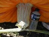 Monday Jacob and I did some work around the garden. As we were picking up firewood, Jacob found our pest control crew having a group hug. Hopefully it will result in some more mouse eaters. We got all of the long gourd trellis panels pulled out and the vines piled up. Tuesday I got the vines burned and half of the steel posts pulled. Today I pulled the rest of the posts, got the new trellis staked out, the center ditch dug out and low spots on the raised beds built up. I spread about 8 wheelbarrow loads of compost on the gourd site. Still lots of work ahead.