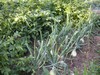 Giant onions growing just beneath the manure pile. These are Schnicker giant onions from the giant veggie exchange. I mulched with hay to keep the weeds down. Behind them are some potatoes that I planned to grow to a large size, I never did thin the potatoes underneath, so who knows what I will get.
