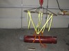 This is a 40 inch ring that I used in testing and it bent. Have placed it on top of a pipe and 6, 5 gallon sized flower pots have been placed in the rings. Hanging baskets could be hung from the out side as in the 27 inch rings. I am sure you can come up with other ideas to make a ring useful when it is not lifting pumpkins. Just remember to remove the straps and put them in a cool dry place for storage until lifting time comes.