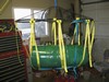 My melon lifting ring. The ring consists of the same rings I make my pumpkin lifting rings with. There are 3 ring welded and supported with 1/4" cold rolled steel. The ring is 13" x 39" and has 8 straps and a closing straps. All straps are 1" tubular nylon rated for 4,200 lbs. I am rating the ring for 800 lbs. I have 2, 5 gallon buckets taped together to look like a melon. The ring can be adjusted by lengthening or shorting straps where attached to the ring.