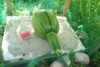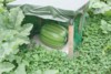 Finally I removed the sticks at the red-arrow and blue-arrow positions and I placed something under my pumpkin. In this case it is a sheet of styrofoam, where I cut a good number of holes in, and then I covered it with fine sand. You see that I placed this sheet of styrofoam in such a way under the fruit that there�s much styrofoam at the stem side of the fruit. Reason is, the fruit will grow in all directions. At the blossom end I can easily add another sheet, but as the fruit grows and the vines in the back of the fruit turn into a dense jungle it will be impossible to add more styrofoam at the stem side of the fruit.