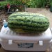 Caption to go with watermellon pic. Second giant watermellon went 104.8 lbs and just barely fit in 110 qt cooler. Cooled it and cut it tonight. Excellent flavor. Made several gallon ziplock bags full.