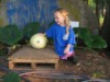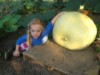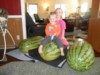 Our Garden Model poses with a 197 Bright, which has reached about 60 pounds. The rate of growth had decreased substantially, so we dug through the patch, and discovered plenty of smaller melons growing on the same plant. The small ones have been culled, so hopefully, it will now return to its previous growth rate of about four pounds per day, or even better.