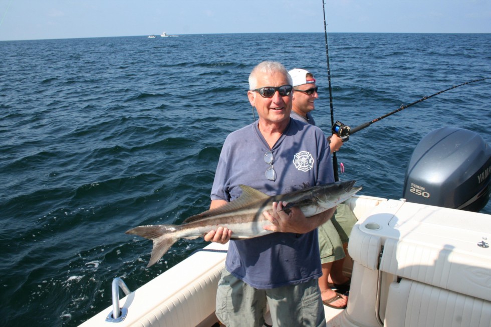 this is my uncle fred and a cobia he caught. we got 7 cobia and kept 2. ummm bow bow they are tasty let me tell you.