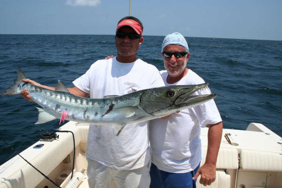 my dad got the big fish of the day thats him on the right and capt. george on the left. 38lb. cudda what a beauty... check them teeth, boy they will cut you