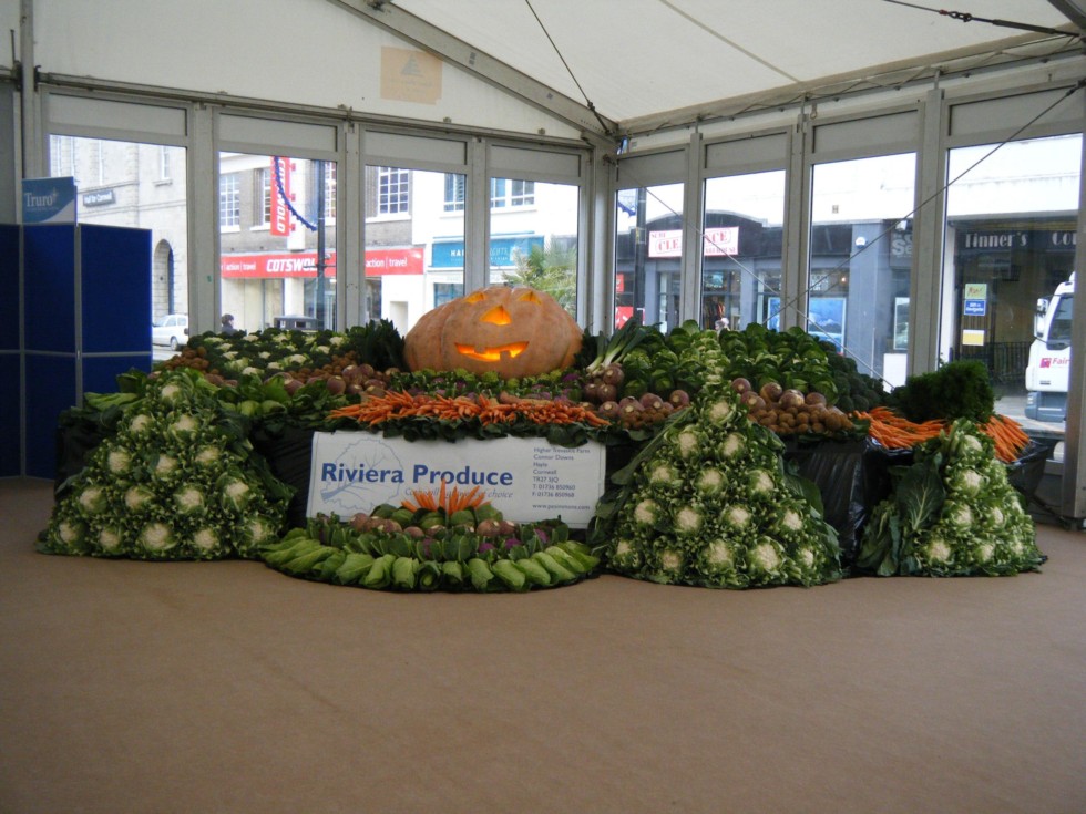 I was asked to do a veg display in Truro for work this week, so the first thought I had was my pumpkin with a Halloween face, it took 4 of us 4 hours to build this.
