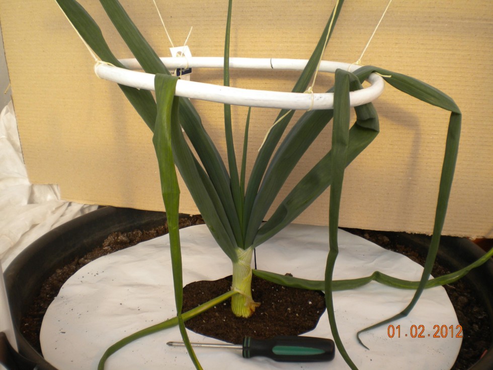 First planted out Onions are beginning to stand up and appear unchecked by their move. 10 green leaves. Hard frosts at present so having to keep the heating going.