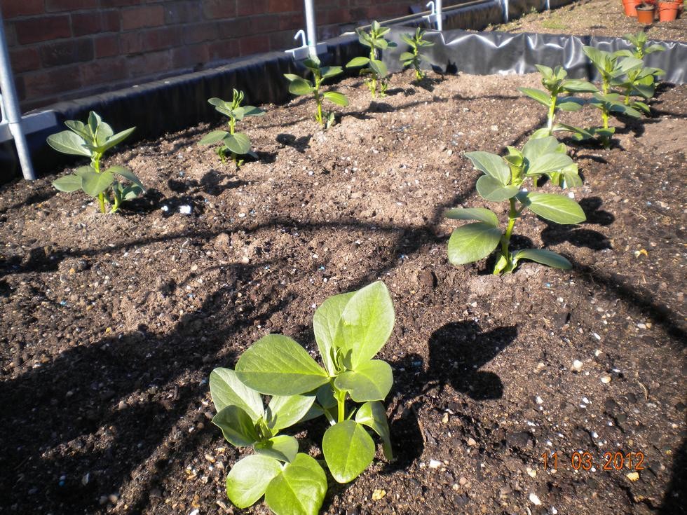 Broad beans have been planted out a couple of weeks and are now established. Weather has been mild and some rain showers. Have not needed to provide protection this year.