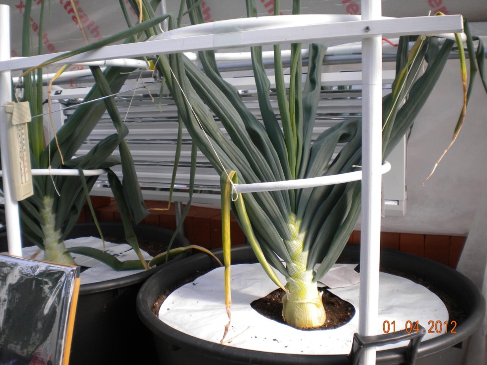 Onions growing very well, this is one of the best, 240mm(9.5") high x 292mm(11.5") circ. with 17green leaves. Perhaps 2weeks ahead of last year - lets hope it continues.