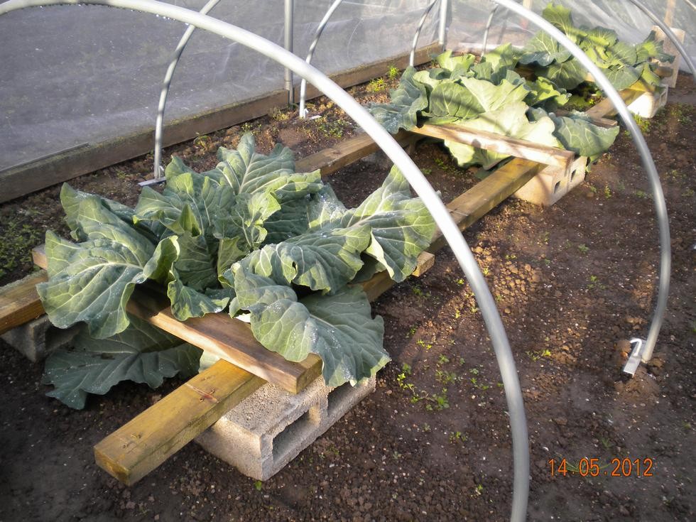 Cabbage now supported on timbers, growing ok, likeing the rain but not the cold. Covers will have to be replaced tonight as -2c forecast. This part of the garden is a frost pocket (even in the middle of May)