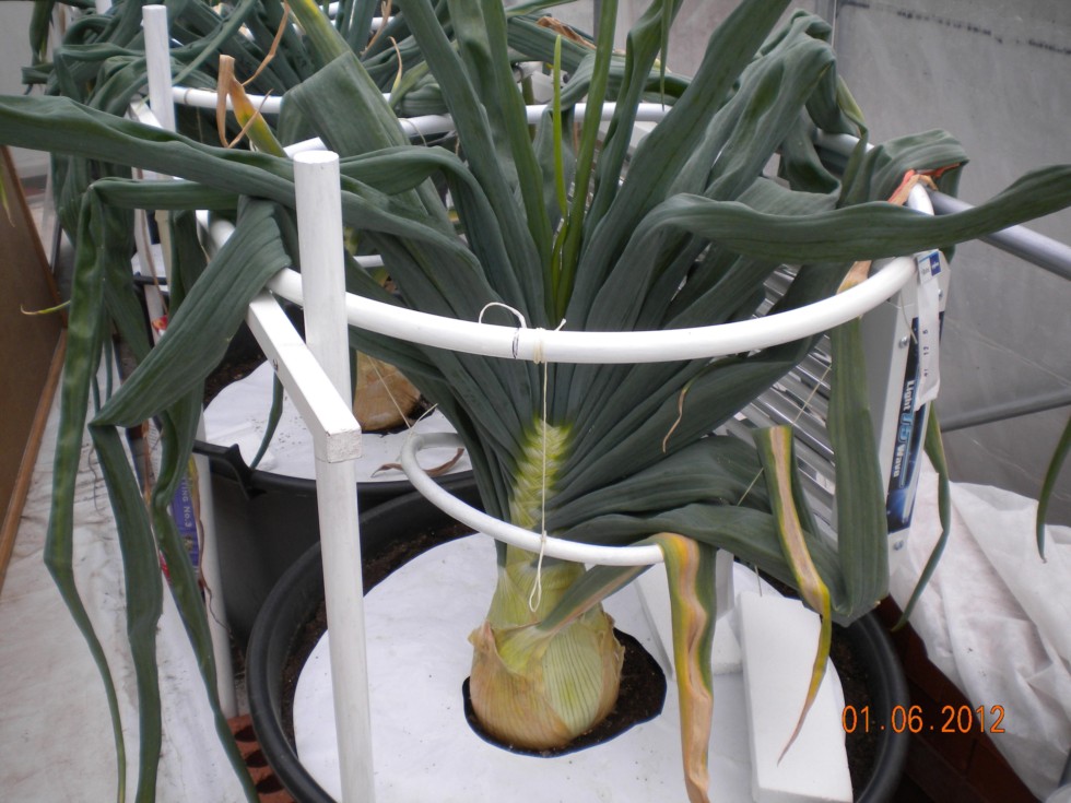 Onions are growing well, even though the recent hot spell has increased the older leaf loss. 525mm(20.7")circ x 373mm(14.7")high with 23green leaves. Only have 10 plants in my tunnel but really 8 would have given them more room.