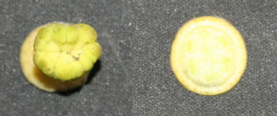Today I removed the first little female from a secondary of my plant A, and just out of curiosity I opened the little thing, and it looked like a beautiful six-lobe. Then, I made a cross-section through the little fruit, and I was surprized that it was a real six-lobe with beautiful symmetry of the rows of seeds (some six-lobes I had cross-cut previously had turned out having been five-plus, which means that one of the six lobes was way smaller than the other five, and this did show up as an asymmetry of the rows of seeds in the cross-section). Hope that this plant will continue this habit of throwing out six-lobe females with marvellous symmetry.