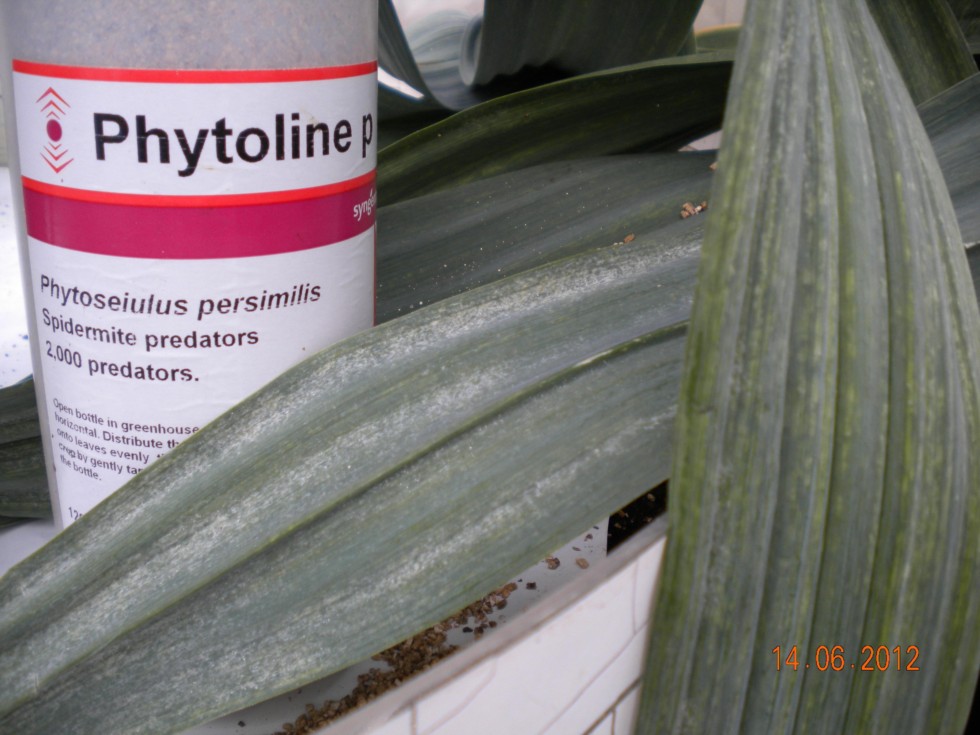 Spidermite on my best giant Leeks, you can see the white discolouration on the centre flag, to the right is a clean one(at present) They have attacked all the plants despite my use of insect predators over the last 3months to prevent this. Predators renewed again today, will see if 2000 can be effective?
