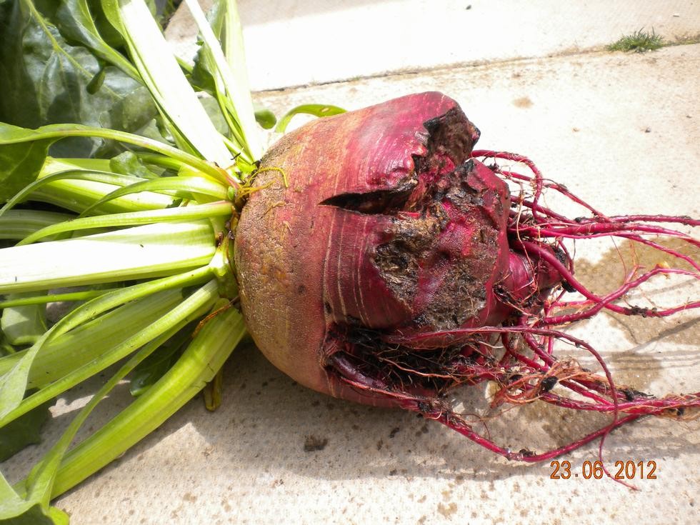 Giant Beetroot problem, major splitting at soil level. It happened last year with the ones in the greenhouse, think it may be due to the root being exposed, subjecting it to extremes of temp/moisture. Raised the soil level around the remaining two plants.