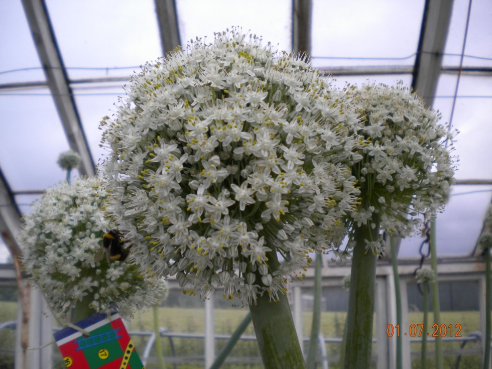 Seeding Onions are producing very strong heads, this is the largest over 125mm(5")dia ball. Hope they all set, there is at least one bee working on them.