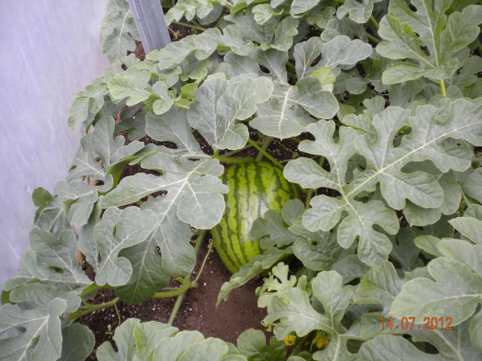 Suprised to find a Water Melon has set in my tunnel as I had not seen the female flower. All plants look healthy but temps day and night are too cold for them. Keeping the area shut up as far as possible.