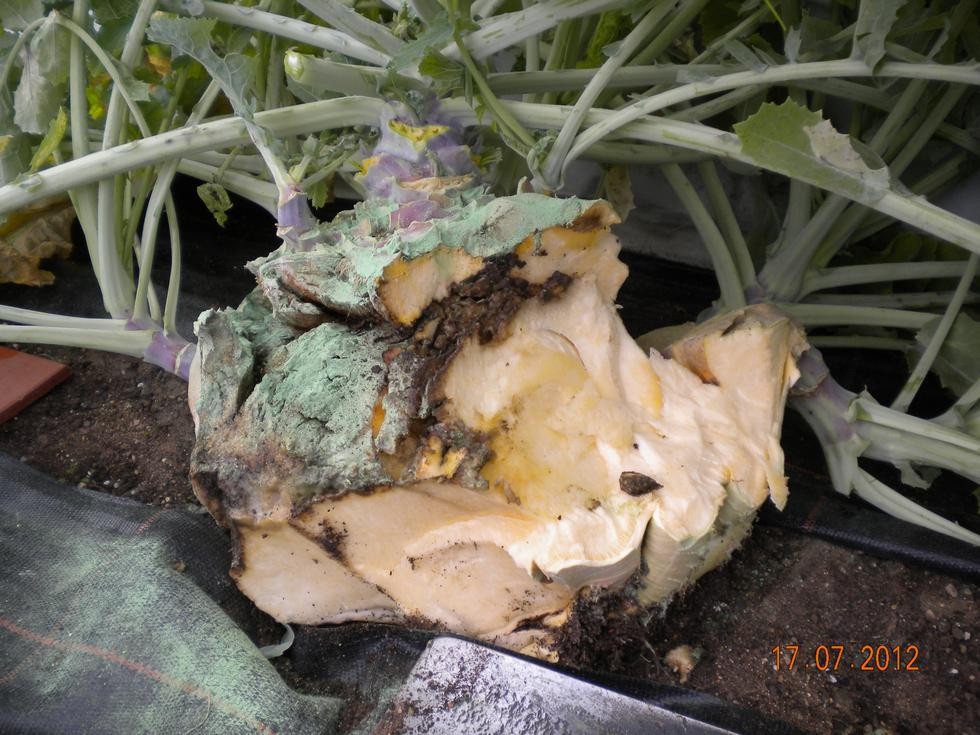 Swede problems, just when I though they were growing large for the time of year. Started with fine cracking around the shoulder, tried to save, finished up having to chop in half to remove from my raised bed. Two others may be going the same way.
