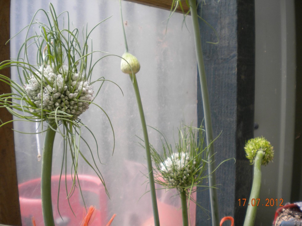 At least my seeding Leeks are ok. Of the four heads in the picture one has not yet opened from its seed caseing, two have and show grass and seed head growth, right hand one has been cut back removing all seed heads which are not wanted. Perhaps early doing this but need all the plants vigour to go into the new grass (young leeks for next season)