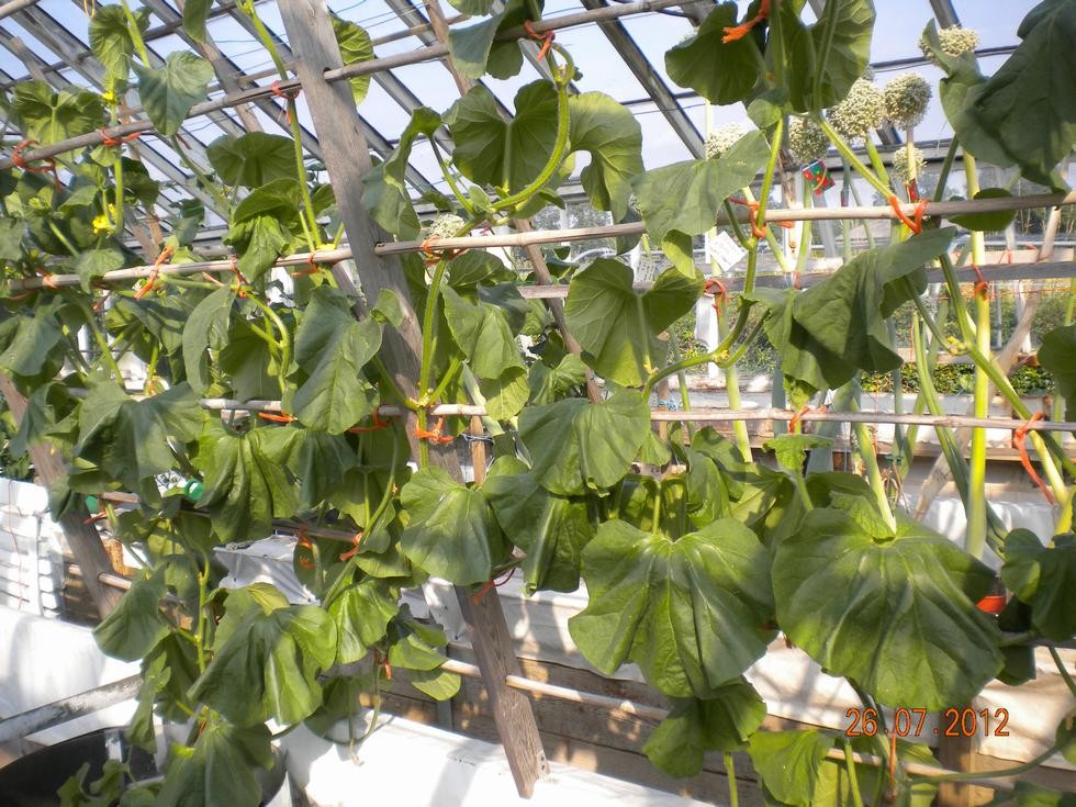 Melon - Plants healthy, but limp this week in the full hot sun, however recover later. The problem is no female flowers to set - similar to last year, weather related,too dark and cold. Cannot see me showing any great size.