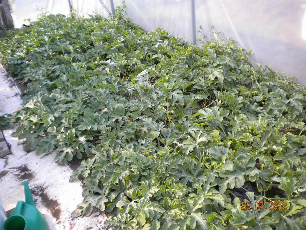 Watermelon - Strong healthy plants in my front tunnel, however no female flowers. Have one set early on which is growing slowly - it is in the photo but you need a magnifying glass to find it.