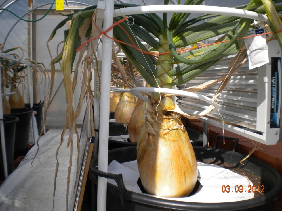 Onion almost at the end of its growing time, may lift it for this weekends show. Measures 705mm(27.7")circ. x 598mm(23.5")high with 22 greenish leaves. Did not make 28"circ. as I hoped but has grow taller during Aug.