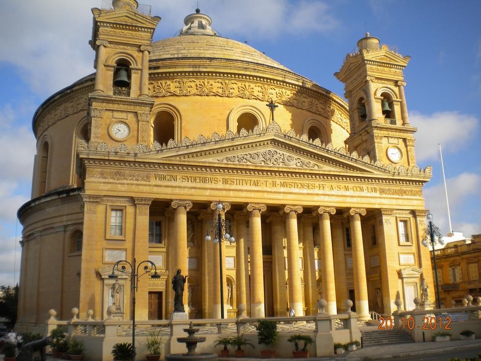 A well needed holiday in Malta, catching up on the sun and some warm dry weather. This is the church at Mosta which has the third largest dome in Europe. It was penetrated by a bomb in the 2nd world war while a service was in progress but by a miracle failed to explode.