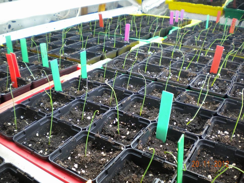 Giant onions were sown on the 5th Nov. and have just pricked them out into their first small pots. Seed from four different heads, so will eventually select the strongest. Under 24hr light in the growroom. This is perhaps the easiest time for me in their 11month growing season.