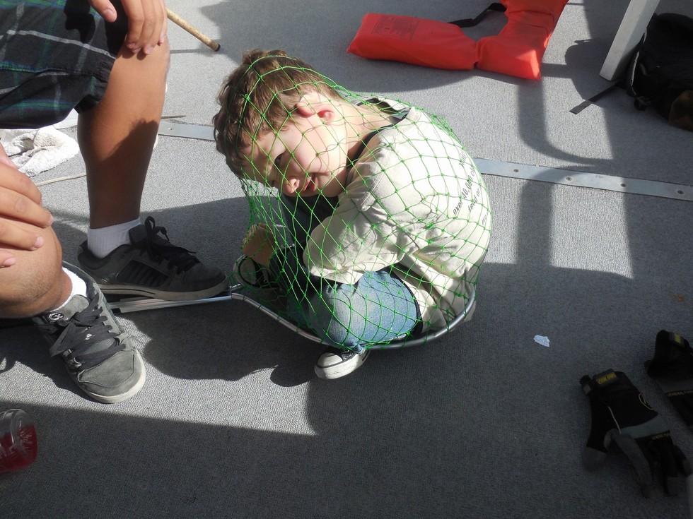 After trolling around for just a couple small rainbows and a deep water large mouth bass Kingston began to act up. We quickly threw the net over him to contain his wild behavior!!!! lol