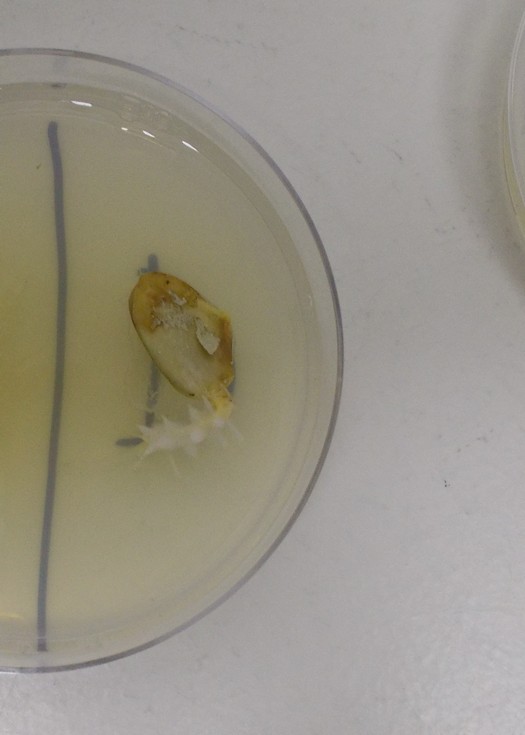 This shows a �normal� radical being formed in the media. While this is a trial seed, if you look closely at the top you will noticed a brown area which is the area of the endosperm/cotyledon leaves and this portion was underdeveloped and is actually just a thin skin of cells. However, in this case the media did the job of supplying not only the right signals to induce germination but also contains the food necessary for growth.