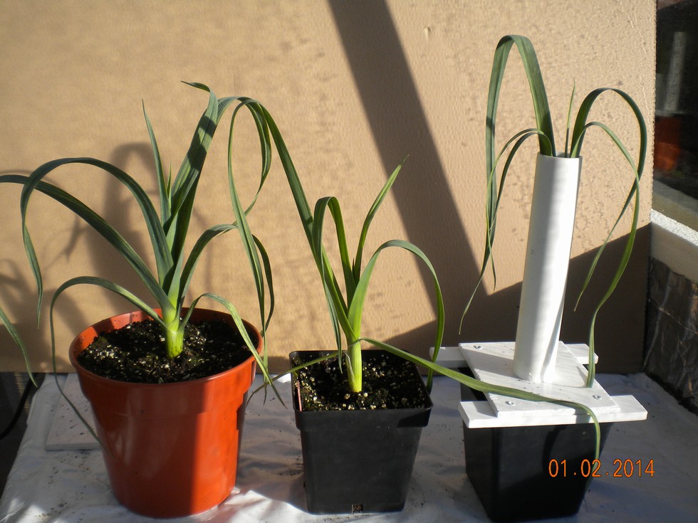 Leeks growing slowly in the greenhouse under supplementary lighting. Pot Leek-Cumbria 9flags, Yorkshire Giant 7flags, Long-Pendal 6flags with 200mm high pipes to start drawing them for length.